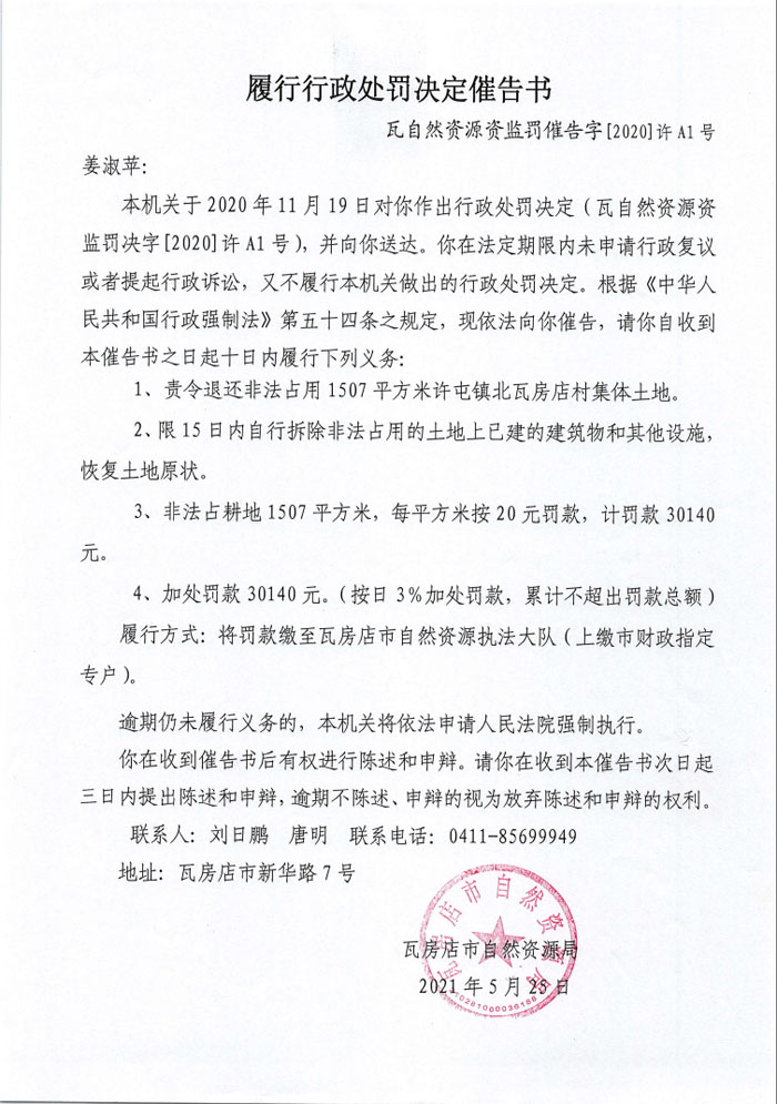 履行行政处罚决定催告书