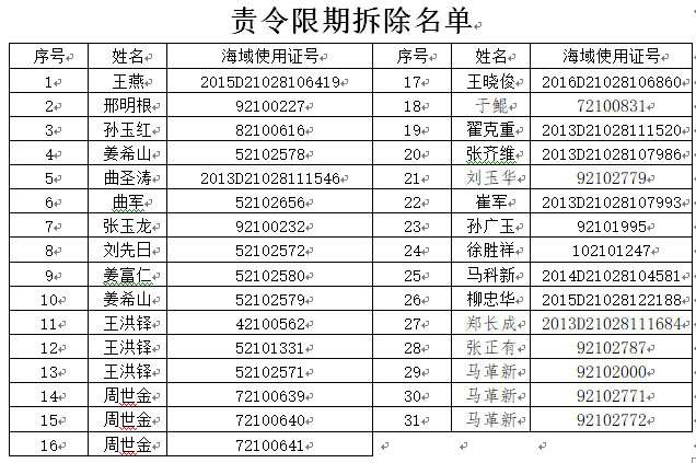 按照中共大连市委、大连市人民政府关于印发《大连市中央生态环境保护督察整改方案》的通知要求(大委发[2022]2号),为完成我市仙浴湾镇、三台乡斑海豹核心区历史遗留问题整改工作任务,2021年9月,我市已将仙浴湾镇、三台乡斑海豹核心区内的海域使用权证依法注销。但执法巡查发现,斑海豹核心区仍有部分单位和个人非法使用海域,根据《中华人民共和国海域使用管理法》第29条、47条规定,我局责令下列用海户,自本公告登报之日起10日内自行拆除用海设施和构筑物,逾期拒不拆除,我局将依法予以处罚。