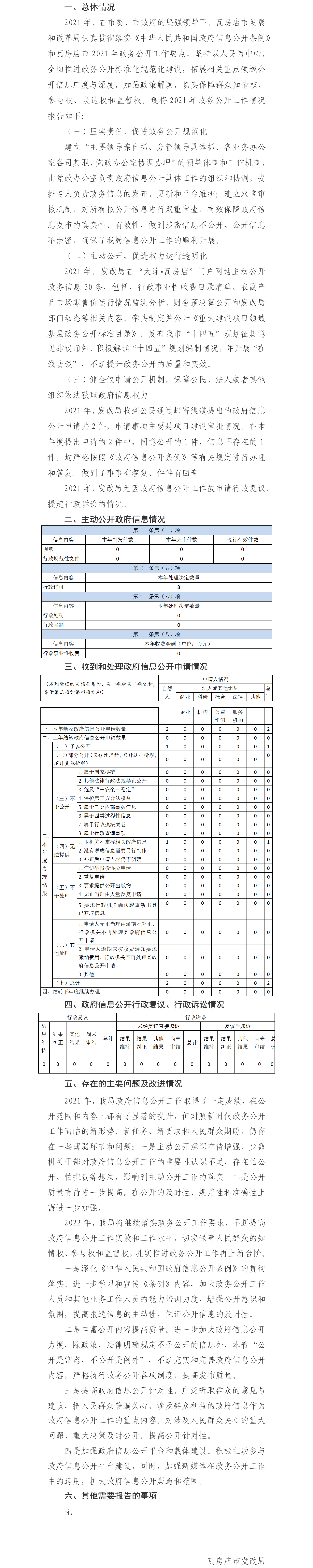 瓦房店市发改局2021年度政府信息公开工作报告