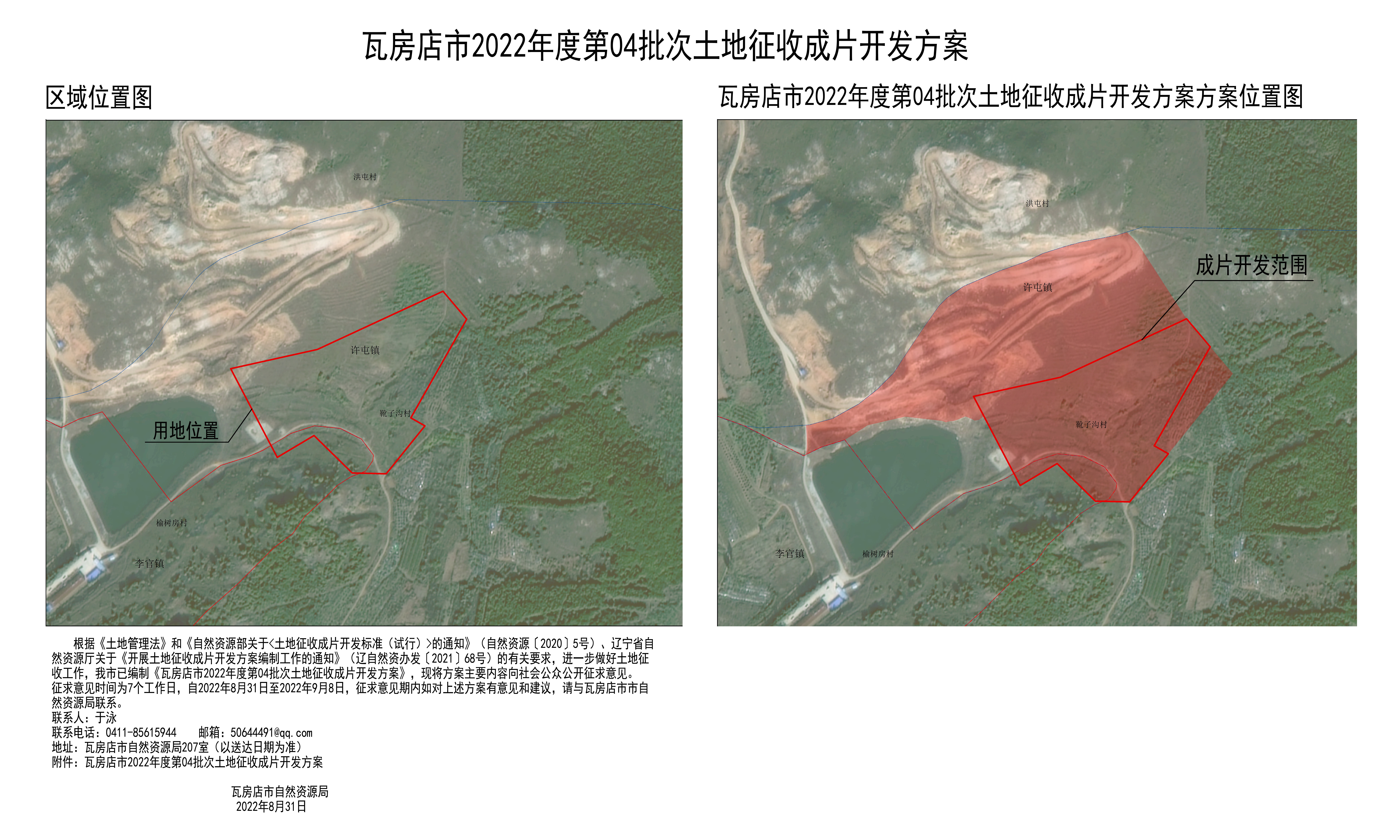 征求意见时间为7个工作日,自2022年8月31日至2022年9月8日,征求意见期内如对上述方案有意见和建议,请与瓦房店市市自然资源局联系。