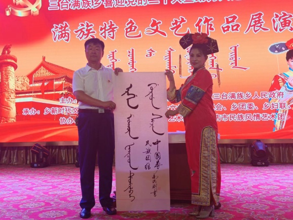 三台满族乡民间艺术团表演了满族舞蹈《故乡是北京》、《关东老蒯》,满族宫廷舞蹈《万福吉祥》、满族格格舞、满族腰铃舞,歌伴舞《颂歌献给伟大的党》、《跳起来舞起来》。三台满族乡文联主席、乡综合文化站站长、大连好人、书法家、国家非遗项目“满文书法”第五代传承人南洪刚在现场书写并展示满文书法,为弘扬中华民族传统文化和传承、保护、发展满族文化起到积极推动作用。三台满族乡综合文化站将充分结合地域特点和满族特色,充分发挥三台满族乡国家非遗“满文书法”传承基地的作用,把“满文书法”这个非遗项目同满族歌舞一起融入校园、融入社区,更好地传承、保护、发展满族文化,为三台满族乡特色文化建设、提升文化软实力和社会综合竞争力而不懈努力。