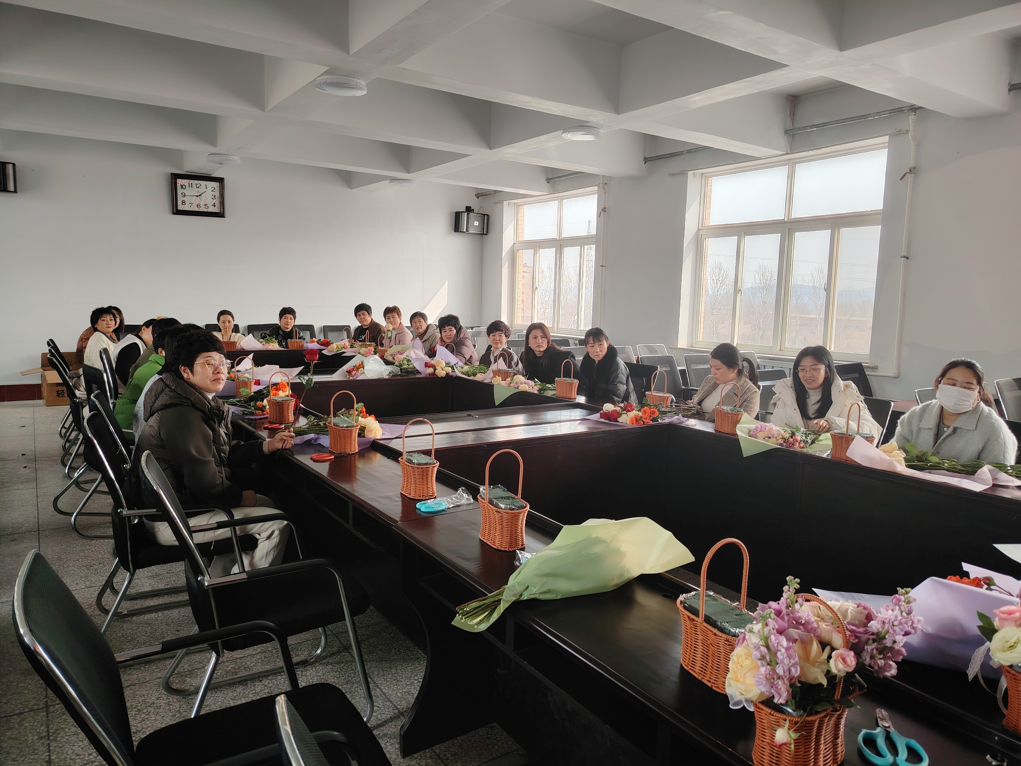 随后,插花培训活动在乡政府三楼会议室温馨开场。花艺老师详细介绍了花材识别、色彩搭配、造型设计等插花技巧,大家充分发挥创造力,修剪花枝、搭配色彩、设计造型,原本普普通通的花材在一双双巧手下,变成了一盆盆精致美丽的插花作品。