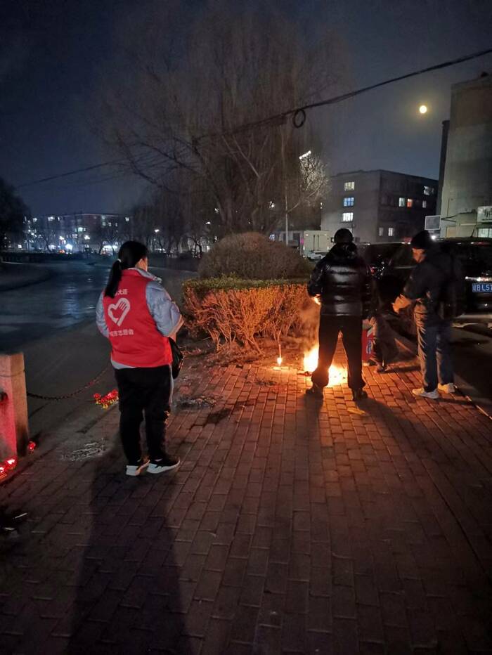 街道工作者在劝导居民今后应避免在马路边缘进行烧纸祭祀行为。