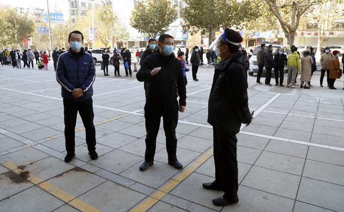 在共济街道富贵家园检测点,周振雷要求,严格落实“一米线”要求,引导市民群众戴好口罩,保持安全距离,有序进行核酸检测,确保各项疫情防控措施落实落细落到位,凝心聚力坚决打赢疫情防控阻击战。