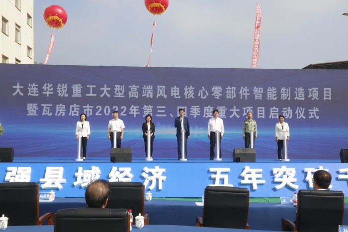 凝心聚力、鼓足干劲,再掀全市项目建设新高潮,9月29号上午,我市举行大连华锐重工大型高端风电核心零部件智能制造项目启动暨瓦房店市2022年第三、四季度重大项目签约开工启动仪式。市领导李巍、赵迎春、宋玉章、李佃会、王占林、刘晓君,市人大、市政府、市政协相关领导,大连重工装备集团有限公司党委书记、董事长孟伟,中国铁工投资建设集团有限公司副总经理李斌以及部分企业家代表等参加启动仪式。