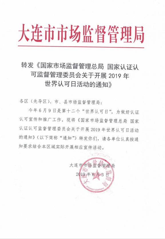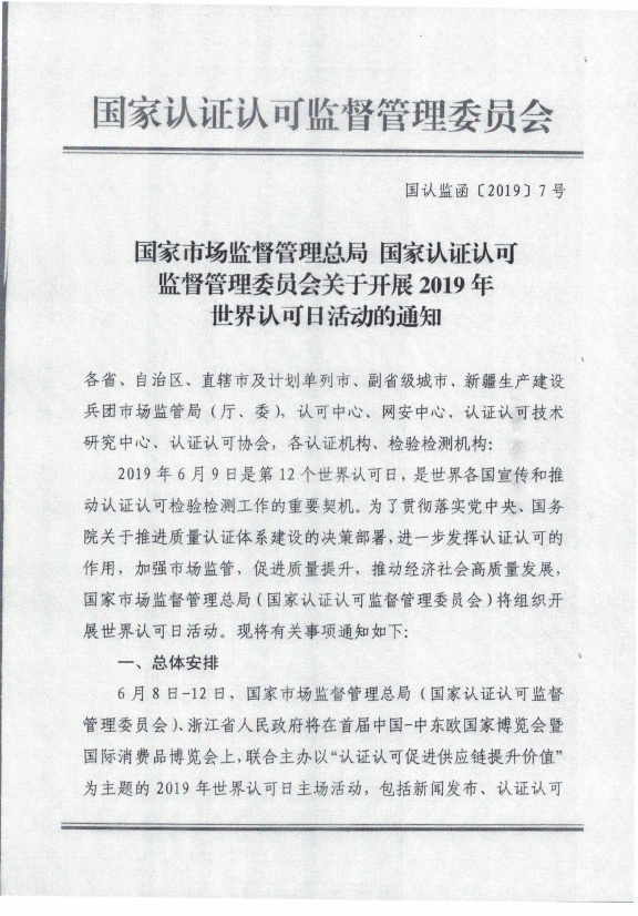 转发《国家市场监管总局国家认证认可监督委员会关于开展2019年世界认可活动的通知